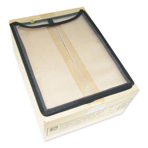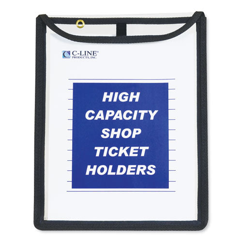 Shop ticket holders are perfect for a number of uses in industrial environments, manufacturing, auto repair, retail stores and inventory control or anywhere else records need to be posted or kept. Gusseted shop ticket holder expands up to 1" to hold instruction books, manuals, and more. Super heavyweight vinyl pocket keeps documents safe. Flap with hook and loop closure keeps documents secure. Strong, rigid, clear vinyl allows for easy visibility of documents. Reinforced black stitched edges for longer product life. Convenient eyelet at top for hanging when open. Store up to 150, 9" x 12" size documents. Load Orientation: Top; Sheet Capacity: 150; Sheet Protector Type: Shop Ticket; Insert Size: 9" x 12" x 1".