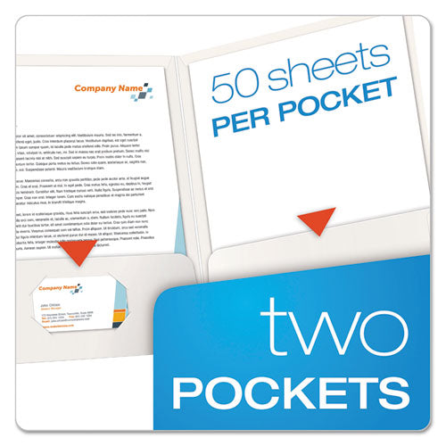 Bright, laminated high-gloss covers get attention. Die-cut business card holder on inside front cover keeps contact information at hand. For 11 x 8.5 sheets. Holds up to 100 sheets (50 per pocket). Front Cover Color(s): White; Color Family: White; Back Cover Color(s): White; Sheet Size: 11 x 8.5.