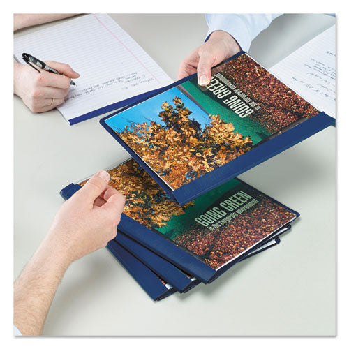 Classic, premium-embossed, coated stock with clear poly front allows full view of title page. Three-prong fasteners hold punched paper. Holds up to 80 letter size sheets. This product was made using wood sourced from a certified managed forest. Front Cover Color(s): Clear; Color Family: Clear; Back Cover Color(s): Dark Blue; Sheet Size: 8 1/2 x 11.
