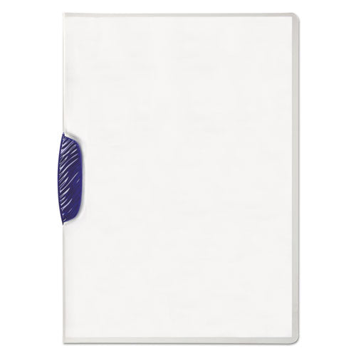 Elegant contoured clip binds documents and holds them in place. Documents can be exchanged or removed quickly and easily. No need to punch holes. Front cover opens flat for easy viewing. Extra-rugged polypropylene is transparent on both sides. Blue Clip. Front Cover Color(s): Clear; Color Family: Clear; Back Cover Color(s): Clear; Sheet Size: 8 1/2 x 11.