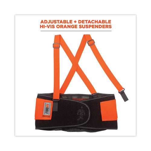 The ProFlex 100HV Economy Hi-Vis Spandex Back Support Brace is designed to remind workers of proper lifting techniques, while enhancing the body's intra-abdominal pressure to move stress away from the spine to minimize the potential for back-pain. Hi-vis orange panels help keep workers conspicuously visible. Durable, yet economic 280D spandex body is as comfortable as it is supportive. Ultra-flexible, stretchable bias binding features zig-zag stitching for enhanced strength. Before lifting heavy objects, simply tighten the support belt to enhance the body’s intra-abdominal pressure; and after lifting, just loosen the belt to achieve a wider range of motion. Innovative Power Panel Positioners keep the tension bands close-to-hand, making it easy to get the desired level of tension. Secure-fit, interior rubber-track webbing prevents the belt from riding up when bending or lifting. Non-conductive polypropylene stays help ensure long-lasting integrity. Adjustable, removable shoulder straps keep the belt on standby until the next lift while allowing the wearer to tailor the shoulder-fit to his or her unique needs. For best results, the support should fit snugly around the wearer's hips, with the front of the support two-fingers below the wearer's navel. When worn correctly, workers can easily maintain the proper posture for lifting, while achieving the extra support required to safely complete the task. Easy-to-use hook-and-loop closure keeps the belt securely fastened while in use. Brace can be worn over or underneath clothing. Machine washable—machine-wash cold and air dry.