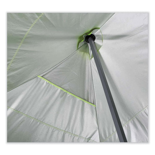 The SHAX 6015 Heavy-Duty Pop-Up Tent is a durable portable shelter providing fast, long-lasting relief from the sun, wind, and rain with a 10 ft x 20 ft footprint. The powder-coated steel frame is built to withstand the elements and won't easily bend or rust like aluminum. ABS plastic sliders on the adjustable legs are more durable and easier to adjust compared to other tents that have push-pins. This portable tent offers three different heights ranging from 9.8 ft to 10.8 ft. Made with thick, high-quality 300-denier polyester material, this heavy-duty 10 ft x 20 ft canopy also boasts waterproofing polyurethane coating (PU) and UV treatment as well as reinforced corners to withstand tough conditions. A double-vented top allows maximum air flow, while the hi-vis lime color and silver coating on interior provide increased visibility on busy jobsites or at events.