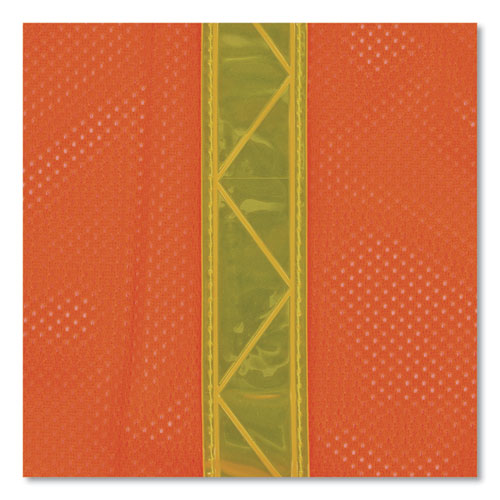 To ensure you stand out against your backdrop, GloWear® 8080BAX Safety Vests feature bright, high-visibility colors enhanced with sewn-on, two-inch-wide reflective-tape stripes—a dual-cross on front and an X on back. Durable, lightweight polyester mesh front and back stand up to just about anything a work area can dish out while helping the wearer stay cool on even the hottest days. Easy-on, easy-off design features break-away shoulders for added safety when working around machinery. Open sides along with a hook-and-loop closure make it easy to get the right fit.