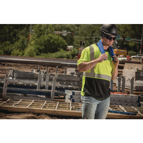 Class 2 black front performance T-shirt made of lightweight birdseye knit paired with 3M Scotchlite Comfort Trim. Moisture wicking treatment and armpit vents keep the user cool and dry. 30+ UPF for protection against harmful UV. An outside chest pocket to keep small items accessible. Black front and collar hide dirt and wear.