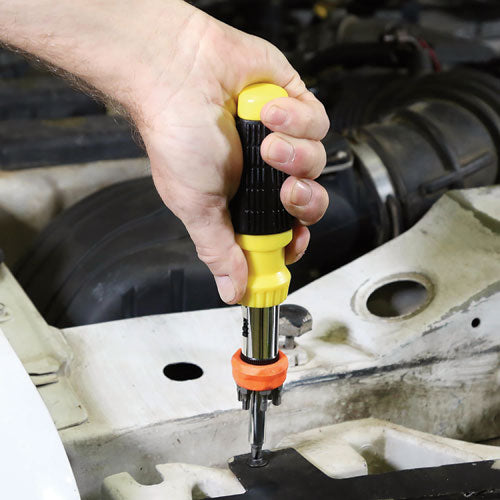 Multipurpose design makes it easy to keep the right tool for just about any job handy. This Ratcheting Screw/Nut Driver Set includes a generous range of precision-ground, sandblasted steel bits and precision-machined, chrome-vanadium steel sockets to ensure accuracy and long-lasting, reliable performance. Reversible driver features a three-position selector switch for clockwise and counterclockwise ratcheting as well as a center lock for standard screw and nut driver performance. Constructed for performance, comfort and durability, the in-line driver features a chrome-vanadium steel shaft, plus an ergonomic, rubberized handle grip to help prevent user fatigue. For added convenience, the set also includes revolver-style bit organizers for keeping six screwdriver bits with you, tucked neatly on the driver's shaft.