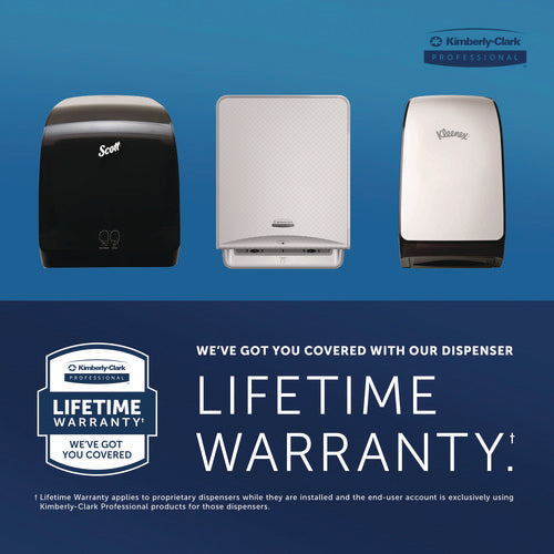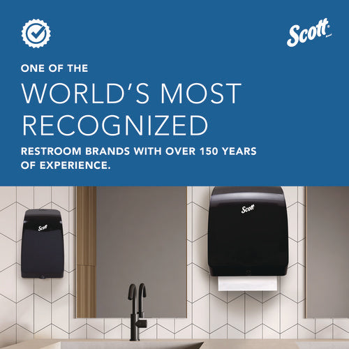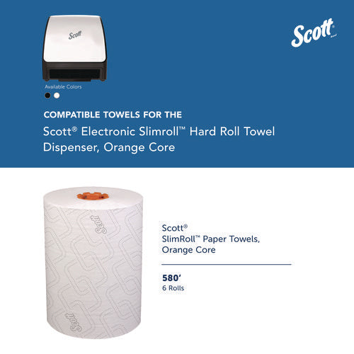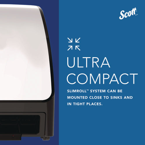 With the Scott® Electronic Slimroll Dispensing System you have the benefit of a compact electronic dispenser designed to fit in tight spaces with a slim profile. The sleek design and touchless dispensing system helps to minimize the spread of dirt and germs all while providing 25% more hand dries over folded towels. The ultra-compact Scott® Slimroll* allows you to mount the dispenser close to sinks and in tight places and keeping it close to the water helps reduce drips and slips. Simply place a hand under the dispenser to receive a nominal 10 inches of towel, a second sheet will dispense at 10% reduced length when activated within a few seconds of the first dispense. The dispenser is made of high impact plastic.