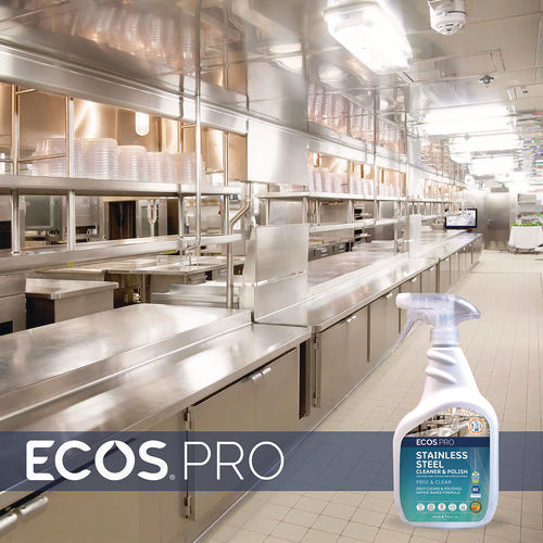 The ECOS PRO reliable and effective water-based formula cleans, polishes, and protects stainless steel surfaces. The cleaner will not leave streaks, hazing, or oily residues behind. Protects against water spots and fingerprints and formulated to perform without harsh fumes. Excellent on other metal surfaces such as aluminum, brass, chrome, copper, zinc, silver, and mild steel. The pH-balanced formula is made using sustainable, plant-powered ingredients, is free of dyes, and is gray water and septic safe. Not tested on animals. Manufactured in a facility that is LEED Zero Carbon, LEED Zero Waste, and LEED Zero Energy Certified.