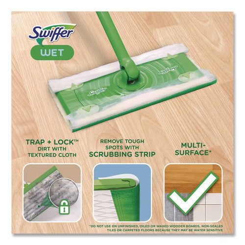 Premoistened cloths for 10" Swiffer sweeper. Wet wipes with a unique cleaning solution work to dissolve tough spots. Convenient disposable wipes remove dirt and grime. Safe for use on linoleum, vinyl, ceramic and finished wood floors. Swipe floors clean and throw wipes away—no rinsing required.