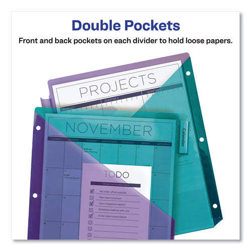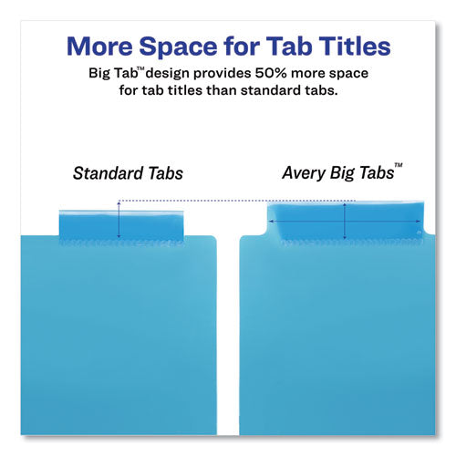 Big Tab™ dividers are bigger, providing 1.5 times more writing space than standard tabs. Special tab design secures inserts, making it easy to insert and remove tab titles. Double front/back pocket style provide extra storage. Durable plastic allows for frequent reference. Index Divider Style: Customizable; Index Divider Size: 11.13 x 9.25; Punched/Unpunched: 3-Hole Punched; For Use With: Ring Binders.