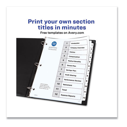 Sometimes finding information at a moment's notice seems like finding a needle in a haystack. These Ready Index® Table of Contents Dividers help you stay organized so you can locate important documents quickly and easily. They feature preprinted alphabetical or numerical tabs that are reinforced for durability and can be used in either landscape or portrait format. Using free templates from Avery Design & Print, you can customize the included title page and print in minutes. Organization and efficiency,— now that's sharp thinking. Index Divider Style: Arabic Numeric; Index Divider Size: 11 x 8.5; Punched/Unpunched: 3-Hole Punched; For Use With: Ring Binders.