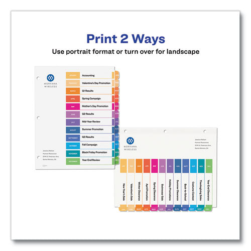 Organized documentation makes a business run like a well-oiled machine. These Ready Index® Table of Contents Dividers help you stay organized so you can locate documents quickly and efficiently. They feature preprinted multicolor tabs that can be displayed in either landscape or portrait format. Using free templates from Avery Design & Print you can customize the included table of contents page and print in minutes. Organization and efficiency—makes life better for your business. For laser and inkjet printers. Traditional Colors. Index Divider Style: Monthly; Index Divider Size: 11 x 8.5; Punched/Unpunched: 3-Hole Punched; For Use With: Ring Binders.