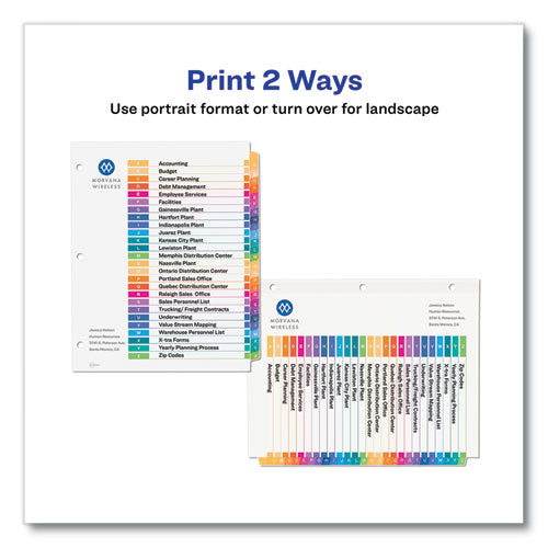 Organized documentation makes a business run like a well-oiled machine. These Ready Index® Table of Contents Dividers help you stay organized so you can locate documents quickly and efficiently. They feature preprinted multicolor tabs that can be displayed in either landscape or portrait format. Using free templates from Avery Design & Print you can customize the included table of contents page and print in minutes. Organization and efficiency—makes life better for your business. For laser and inkjet printers. Traditional Colors. Index Divider Style: Alpha; Index Divider Size: 11 x 8.5; Punched/Unpunched: 3-Hole Punched; For Use With: Ring Binders.