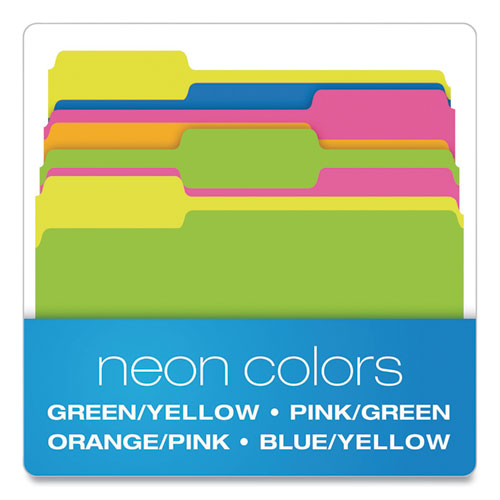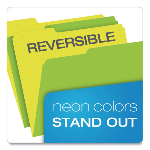 You get a total of five colors among four folders, but you have eight combinations with the reversible design. Folder colors are green/yellow, pink/green, orange/pink and blue/yellow. Turn the folders inside-out if you need to change-up the order of your system for convenience. Standard 11-point construction works best for ordinary computer paper, glossy brochures and photos. Each folder can expand to hold up to 150, 8.5" x 11" pages, which amounts to a medium-sized report. These folders work well for employee files, daily transaction records, everyday financial statements, signed documents and printed correspondence. Staggered tabs let you label each folder appropriately, including hand-writing words, letters or numbers on folders. Alternatively, go for a professional look by printing customized labels on your computer. The expandable filing system gives you complete freedom to organize your desktop, file cabinets, archival storage or employee documents. File Folder Size Type: Letter; File Folder Color: Assorted; Color Family: Multicolor; File Folder Color Assortment: Blue/Yellow; Green/Yellow; Orange/Pink; Pink/Green.