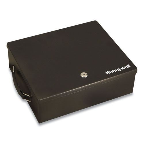 Features a key lock with two entry keys included, a solid steel construction to protect your valuables, and two carry handles for convenient moving of the box. Double steel walls and a fire-resistant insulation to better protect your documents and small valuables in case of a fire. Cash Drawer/Box/Tray Type: Box; Carrying Method: Carry Handles; Material(s): Steel; Width: 11".
