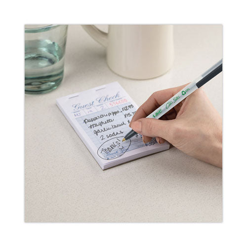 The BIC ReVolution Clic Stic ballpoint pen is made of recycled plastic and the packaging is made entirely of recycled materials. It has a multipurpose ballpoint tip and long-lasting ink delivers hours of writing. The slender, round semi-clear barrel is not only comfortable to (be)hold, but it's also got a handy window for checking your ink level. Use the convenient clip to hook it onto your pocket or notebook and take it everywhere you go. And since it's retractable, there's no cap to lose!