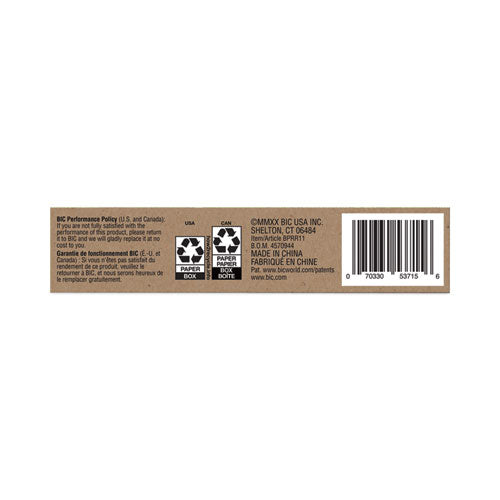 Retractable BIC ReVolution Ocean Bound ballpoint pen features a barrel made of ocean-bound recycled plastic. Packaging is also made entirely of recycled materials. This long-lasting, smooth writing pen is suited for many uses, from jotting down notes to drawing in the margins of your notebook. Once you run out of ink, no need to throw the pen away! Ink refills are available to extend this pen's life. Join the BIC ReVolution and help write our future together.