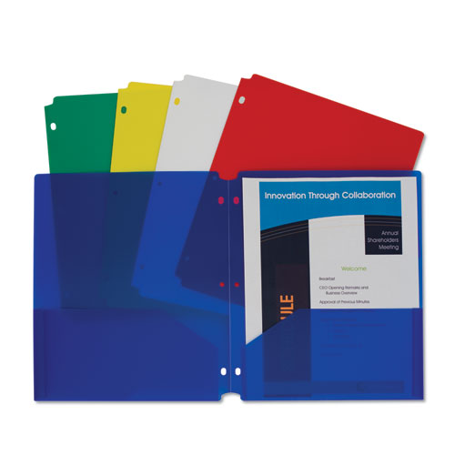 Two-pocket heavyweight polypropylene folders with three-hole punch hold papers and resist tearing. Features three-hole punching for secure storage in standard three-ring binders. Cut-outs at the top and bottom keep portfolio from being caught in binder open-close mechanism. This product will be cheerfully replaced with one of equal value if defective in materials, manufacturing or packaging at the time of purchase. Except for such replacement, this product is sold without warranty or liability even though defect, damage or loss is caused by negligence or other fault.