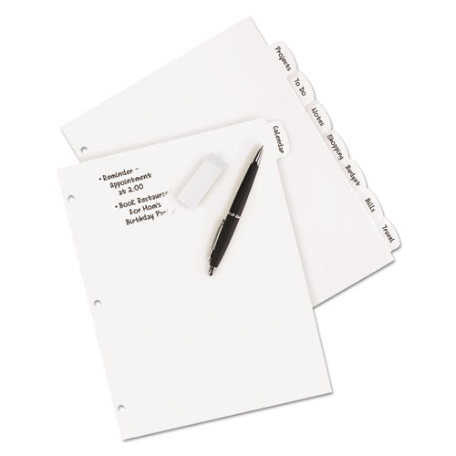 Get your binder organization on the right track with these Durable Plastic Write-On Dividers. The stylish tab design offers plenty of room for you to label each divider for reference at a glance. Stylishly shaped Big Tab™ Dividers are larger, providing 50% more writing space than standard tabs. Using your ballpoint pen or pencil, you can customize your dividers easily. To reuse, simply erase your previous label and write in the new one. Use the Corner Lock™ With Expandable Pocket or slash pockets for storage. Plastic dividers also available in large 11" x 17" and mini size. You'll be on the road to better organization with these dividers. Big Tab™—Three-hole punched. Index Divider Style: Customizable; Index Divider Size: 11 x 8.5; Punched/Unpunched: 3-Hole Punched; For Use With: Ring Binders.
