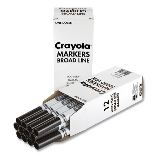 Order your favorite Crayola marker color in bulk! Conveniently packaged in a reusable tuck box, each set contains 12 of the same color. With its conical tip, the Crayola broad-line marker is a versatile drawing tool. Perfect for coloring in large areas, this marker is also great for drawing thin lines or dots. Kids can even create a ribbon effect with lines that taper from thick to thin. The broad-line marker lays down plenty of color and won't smudge or bleed through paper. Great for classrooms, art studios, and more!
