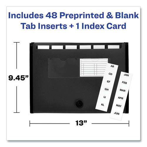 Package Includes: (1) Index Card; (1) Preprinted Set of A-Z; (1) Preprinted Set Monthly Tab Inserts; (1) Set of Blank, Handwritable Tab Inserts