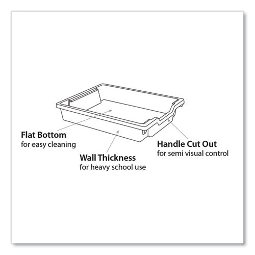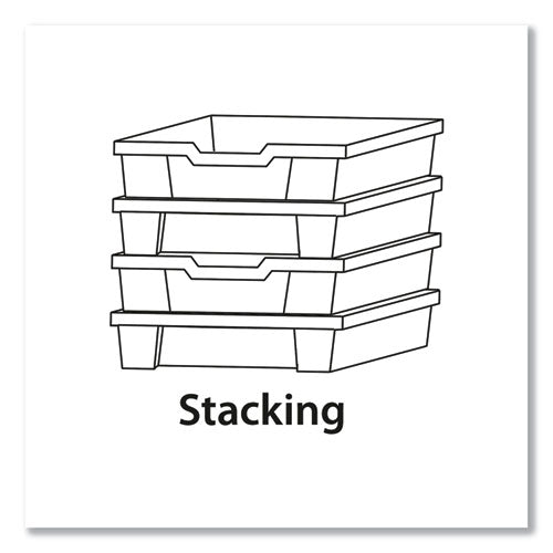 Iconic, Worlddidac award-winning F1 Shallow Trays are found in learning environments all over the world. Made of fully recyclable materials, each tray is molded to a standardized size for seamless integration into Gratnells Storage Frames and Trolleys, so you can easily reconfigure your bins and resource areas to the unit or project at hand. With enough foresight, you can even color-code accordingly. Loved by teachers and students alike, these strong, rigid bins are all BSI approved for heavy educational use. Semi-fire-retardant (0.22 mm per minute), anti-static, talc-filled polypropylene construction ensures high-resistance to a variety of chemicals and contaminants, making it a superior choice over ABS in almost any environment, doubly so in science labs as well as art, shop and electronics classrooms. Whether it’s art or science-lab supplies, whether it’s worksheets or robotics kits, there’s a tray to meet your needs. Stackable and nestable with built-in carry handles, these bins are also compatible with a variety of available dividers and lids (lids and dividers sold separately).