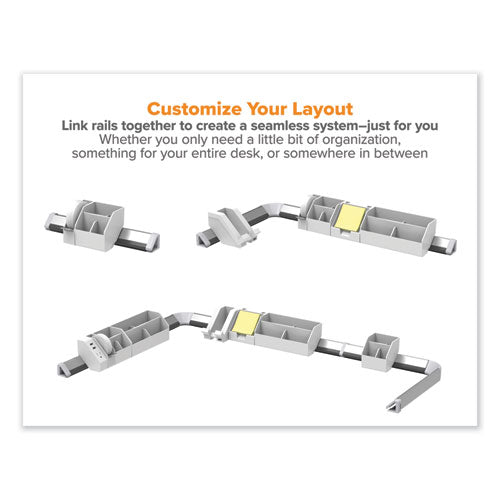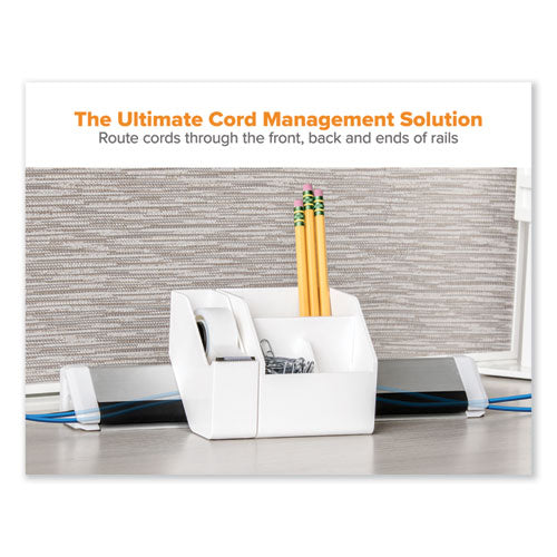 Some say that organization is the key to success, and they're right! This five-piece Konnect™ workspace and cord management kit provides a fully functional desktop from corner to corner. Hide unsightly cords and tangled wires with the 21.5 cord management rail. It also allows you to dock any of the Konnect™ accessories right to your desktop. Four unique docking units are included in this office supply organizer kit. The tape dispenser is thin and compact, allowing for easy dispensing with the extended blade. It comes with a roll of office tape to keep you prepared. The sticky note holder holds business cards and sticky notes, preventing fly-away memos from getting lost. The short storage bin holds tacks, pens and a variety of other small items that are essential to your office. The USB phone dock offers a safe area to keep your phone. It features a USB port for easy device charging and viewing. Konnect™ is an easy fix for desktop clutter, combining all work essentials into one desk organizer system.