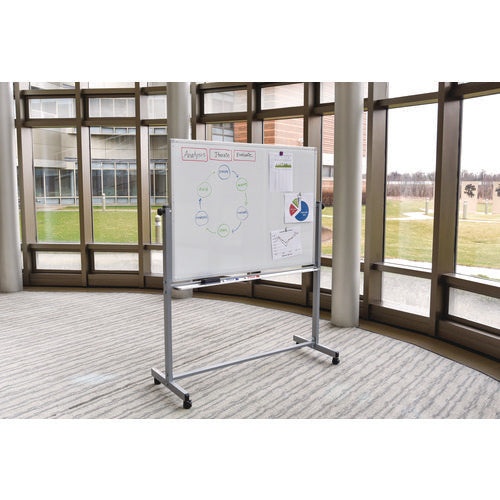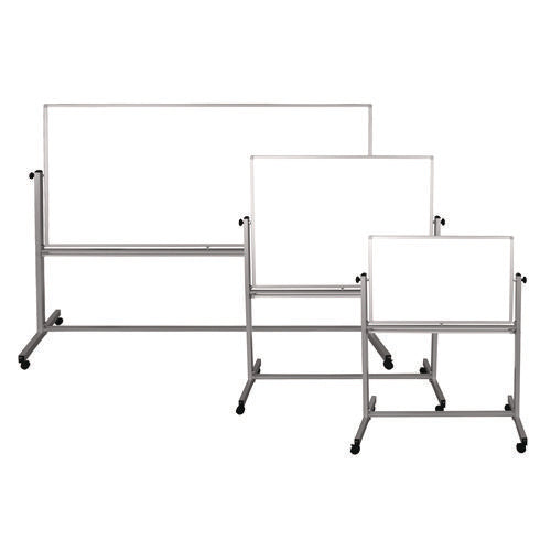 Built for brainstorming, teaching or organizing ideas and information, this Luxor mobile magnetic dry erase board doubles the writing space and delivers the durable mobility needed for dynamic workspaces. A slender-yet-sturdy frame provides a professional appearance and rolling casters make it easy move around a room. To flip the board, simply loosen the side knobs and disengage the spring-loaded locking clip. Need to display charts, papers or photos? Use the magnetic surface as a bulletin board. Look no further for a high-quality, affordable mobile marker board.