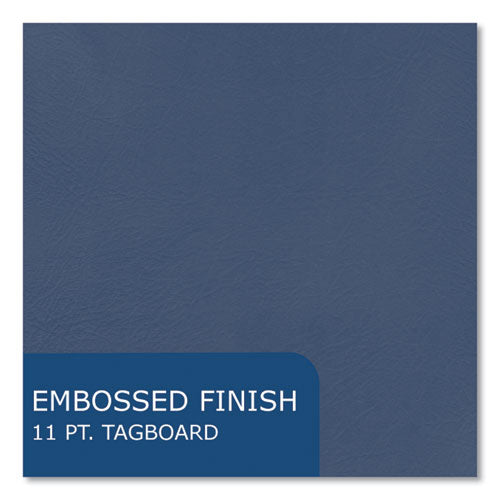 These folders have an embossed leatherette finish. Each folder has three prongs and eyelets for paper storage. Convenient inside pockets provide easy access. The color is printed on durable white tag stock. Colored outsides, inside surface is white.