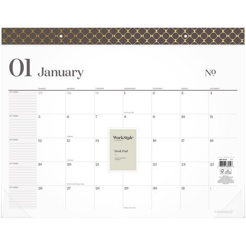 Simple. Sophisticated. Stylish. Embrace your inner fashionista, and keep your plans on track throughout the year with the WorkStyle Monthly Desk Pad Calendar. Never miss a moment. This calendar’s monthly pages feature unruled daily blocks designed for detailed year-round planning, making it easy to see your big-picture plans in an instant. Create a lasting relationship with your calendar. The durable top binding helps the calendar stand up to wear and tear, and its pre-punched eyelets accommodate wall hanging. Keep your pages organized. Two poly corners help keep pages flat, while a clear overlay helps protect your planning notes. Each page is also perforated for neat and easy removal.