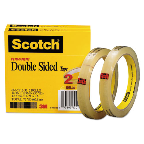 Scotch® Double-Sided Tape features permanent adhesive on both sides of the tape, making it a perfect, no-mess alternative to glue for light-duty attaching and mounting tasks. The tape pulls off the roll smoothly and cuts easily, with no liner to deal with, and it's safe for color photos. Core Size: 3"; Dispenser Included: No; Width: 0.5"; Length: 36 yds.