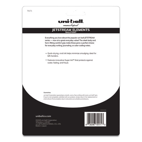 Everything you love about the popular uni-ball JETSTREAM series—now at a great everyday value! The sleek body and form-fitting comfort grip make these pens a perfect choice for everyday writing, journaling or color-coding notes. Exclusive, low-viscosity Super Ink™ combines the quick drying time of a ballpoint with the vibrant color and smoothness of a gel pen. uni Super-Ink™ technology protects against water, fading, and fraud. Pen Sub-Brand & SKU Line: Jetstream Elements; Pen Style: Retractable; Pen Type: Ballpoint; Refillable (Yes/No): No.