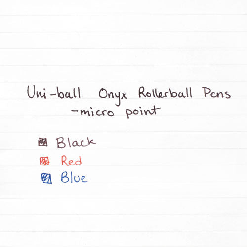 The uni-ball ONYX Rollerball Pen is built to be a great pen at a great price. Designed with a strong metal point to produce smooth, consistent writing, and finished off with a durable plastic clip, this roller pen will perform for years. The uni-ball ONYX pen also features uni super ink which protects against water, fading and fraud. Featuring an economical design, these uni-ball pens are ideal for the office. Pen Sub-Brand & SKU Line: ONYX®; Pen Style: Stick; Pen Type: Roller Ball Pen; Refillable (Yes/No): No.