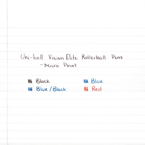 Experience consistent, fluid writing with uni-ball Vision Elite Rollerball pens. Ideal for business travelers, these rollerball pens are designed to be airplane-safe and won’t leak in flight. They feature the innovative uni-Flow Ink System that creates a steady flow of water-resistant ink for smooth, consistent writing. Pen Sub-Brand & SKU Line: VISION ELITE™; Pen Style: Stick; Pen Type: Roller Ball Pen; Refillable (Yes/No): No.