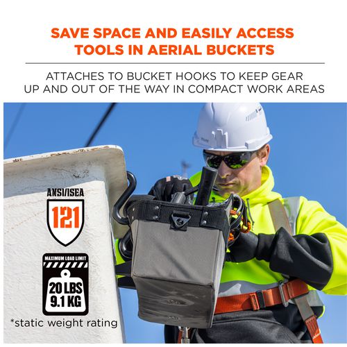 The Arsenal 5844 Bucket Truck Tool Bag is designed to hang from aerial bucket hooks for secure storage, convenient tool organization, accessible tethering and prevention of dropped objects. Using a hanging tool bag maximizes space in compact buckets by keeping gear off the floor and out of the way. Unlike most other bucket storage solutions, this portable bag has a rigid freestanding base and carrying straps for versatile use in and out of buckets, preventing workers from needing an additional tool bag for other work environments. Also features standoffs on the side of the bag to keep it upright when hanging inside a bucket. Built for durability in demanding environments, this bucket bag is constructed of abrasion-resistant ballistic polyester with heavy-duty nylon webbing straps and nickel-plated grommets. A storm drain prevents water from building up inside and damaging tools. Ideal for work in bucket trucks, including telecom and utilities.