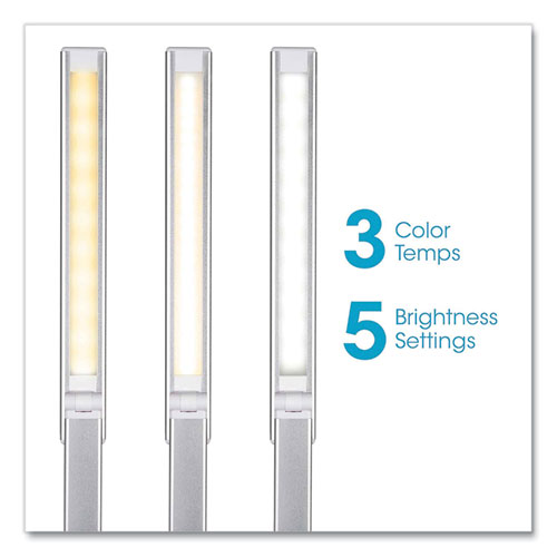 Give your space a total lighting upgrade with the OttLite Entice LED Desk Lamp with Wireless Charging. Part of the OttLite Wellness Series, this feature-packed folding lamp helps reduce eyestrain with next generation ClearSun LED technology, as close to natural daylight as you can get. Also includes two additional color temperature modes (warm white and bright white). Easily adjust the brightness with the up and down buttons. With two points of articulation on the sleek aluminum arm, you can easily place the soothing, low glare illumination right where you need it. And, to keep your devices fully charged use the Qi-wireless charging pad or the 5V, 2.1A USB port.