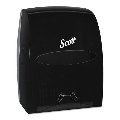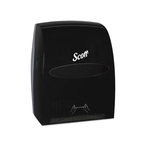 The Scott® Essential* Towel Dispenser System is designed to provide long-lasting service, reducing disruptions and user complaints. Touchless dispensing reduces the spread of germs and creates a more hygienic environment. Battery-free dispenser provides long-lasting service with less necessary maintenance. Easy to reload in a few simple steps. Transparent dispenser allows you to check supply levels without opening dispenser. Towels Dispensers Type: Roll Towel Dispenser; Capacity (text): 950 ft Roll; Material(s): ABS Plastic; Color(s): Black.