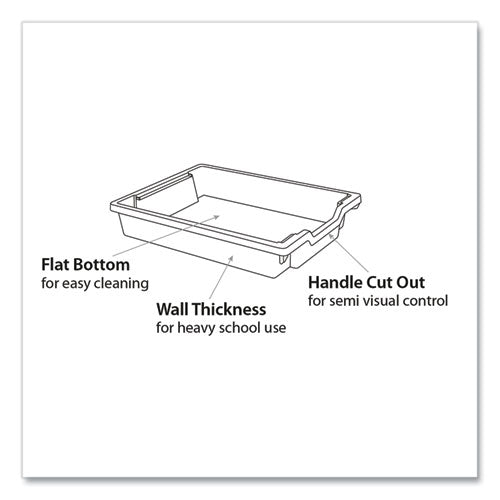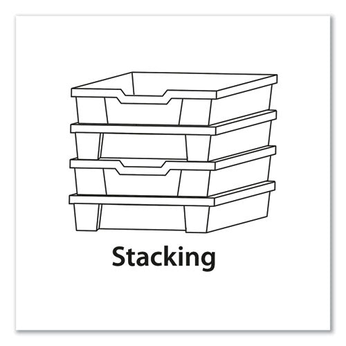 Iconic, Worlddidac award-winning F1 Shallow Trays are found in learning environments all over the world. Made of fully recyclable materials, each tray is molded to a standardized size for seamless integration into Gratnells Storage Frames and Trolleys, so you can easily reconfigure your bins and resource areas to the unit or project at hand. With enough foresight, you can even color-code accordingly. Loved by teachers and students alike, these strong, rigid bins are all BSI approved for heavy educational use. Semi-fire-retardant (0.22 mm per minute), anti-static, talc-filled polypropylene construction ensures high-resistance to a variety of chemicals and contaminants, making it a superior choice over ABS in almost any environment, doubly so in science labs as well as art, shop and electronics classrooms. Whether it’s art or science-lab supplies, whether it’s worksheets or robotics kits, there’s a tray to meet your needs. Stackable and nestable with built-in carry handles, these bins are also compatible with a variety of available dividers and lids (lids and dividers sold separately).