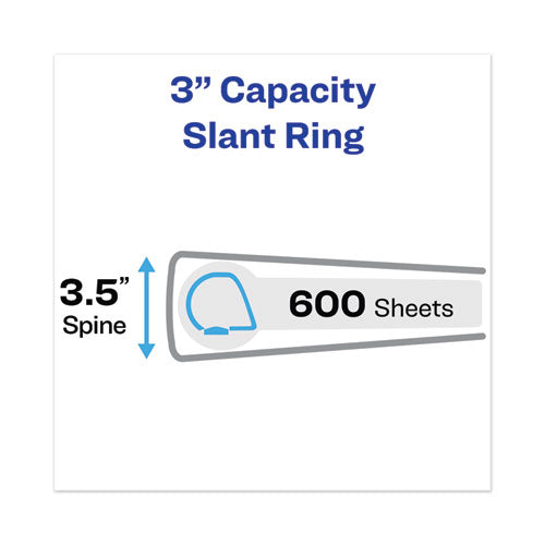 Heavy-Duty view binder with one touch EZD® rings is perfect for long-term, regular use. Tear-resistant DuraHinge® design is stronger and lasts longer. DuraEdge® feature makes the sides and top more pliable, providing greater split resistance. Deep-textured film offers a smoother finish and features a linen pattern for a high-quality look and feel. Clear cover and spine for easy customization. Four clear, interior pockets provide extra storage space. Wider front and back panels fully cover standard dividers and sheet protectors. One touch EZD® rings provide easy access and have a higher page capacity when compared to the same size round rings. Customize the cover with free, easy-to-use templates and designs at Avery® Design & Print online. Locking Rings—Keep pages secure. Binder Type: Ring; Binder Style: View; Binder Size Capacity: 3"; Binder Sheet Capacity: 670.