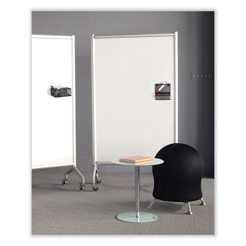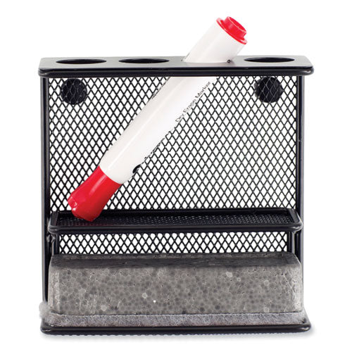 The Onyx™ Mesh Marker Holder with Shelf is a magnetic whiteboard accessory that makes a great addition to any dry erase marker board for easy storage and organization. It includes four stand-up marker holders that fit most standard whiteboard dry erase markers, making it easy to grab a marker when needed and helping to ensure markers are stored upside down so that they last longer. This organizer also includes a 5 wide shelf for storing the marker board eraser. Its magnetic back allows for use on whiteboards as well as any other magnetic surface and is held up by rare earth magnets, which are strong enough to work on magnetic glass marker boards as well as standard magnetic whiteboards. This diverse caddy can also be mounted to a wall with use of a steel plate (included). The steel wire mesh construction is sturdy and also has a powder-coated finish for scratch-resistance. The rolled edges are smooth to the touch and give a polished appearance to the caddy. Great for use alongside whiteboards in classrooms, meeting spaces, training areas, conference rooms or offices.