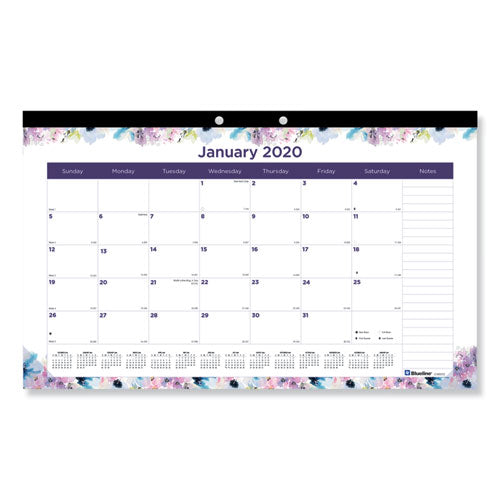 Professional desk pad calendar with bold, easy-to-read dates. One month per page, one block per day. Reinforced chipboard back and vinyl corners. Tear-off sheets, bound at top. Features a generous notes area and a yearly reference calendar at the bottom of each sheet. Size: 22 x 17; Page Color/Theme: Floral; Edition Year: 2021; Calendar Term: 12-Month (Jan-Dec).