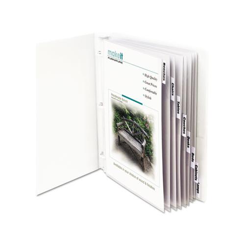 Stay organized with the all-in-one sheet protector and index. Avoid the added task of attaching indexes and eliminate the extra bulk. Includes laser or inkjet printer inserts for customization. Heavyweight sheet protectors are durable and are made of acid-free material, which prevents photocopy transfer. No sheet punching necessary, since they are already pre-punched to fit standard three-ring binders. For 8 1/2" x 11" document storage. With 8 Clear Tabs. Load Orientation: Top; Sheet Capacity: 2; Sheet Protector Type: Ring Binder; Insert Size: 8.5 x 11.