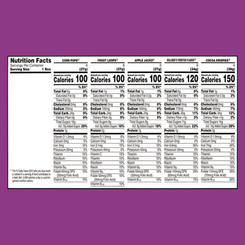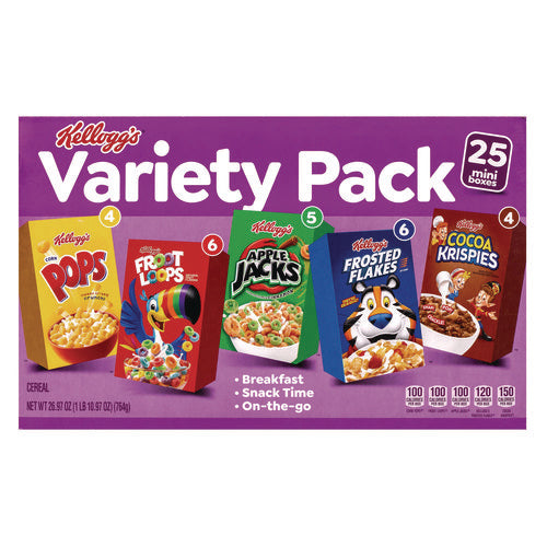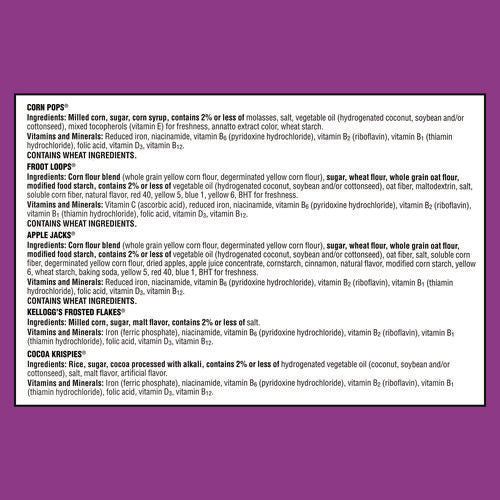 A sweet, crispy, crunchy way to start your day, Kellogg's Cereals make for a delicious cold breakfast any morning of the week. Featuring five tasty cereals, the Kellogg's Cereal Variety Pack is a good source of at least seven vitamins and minerals. Individually sized and conveniently packaged, these delicious cereals are an ideal companion for lunch boxes, after-school snacks, and busy, on-the-go moments. Just add your favorite dairy or nut-milk or enjoy as a crispy treat straight from the miniature box. This variety pack contains Corn Pops, Froot Loops, Apple Jacks, Frosted Flakes and Cocoa Krispies.