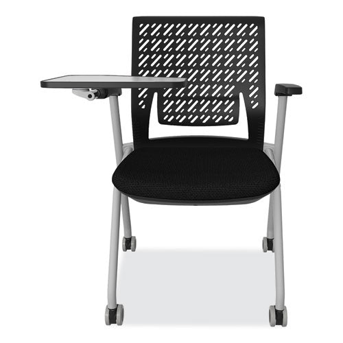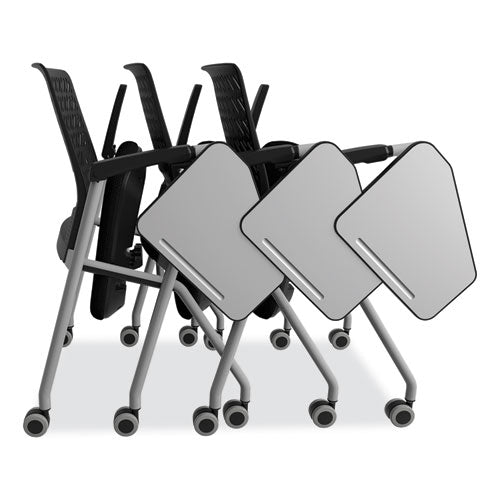 Nesting chair perfect for meetings, training, conference, classroom and more. Seat flips up for compact nesting and movement. Included tablet for ease of note-taking. Writing surface/tablet automatically moves into storage position as user moves. Flex back features flexible plastic backrest for additional seated comfort and gentle recline.